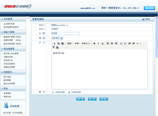 您当前的位置:义乌263企业邮箱首页> 管理员使用手册 > 设置欢迎信