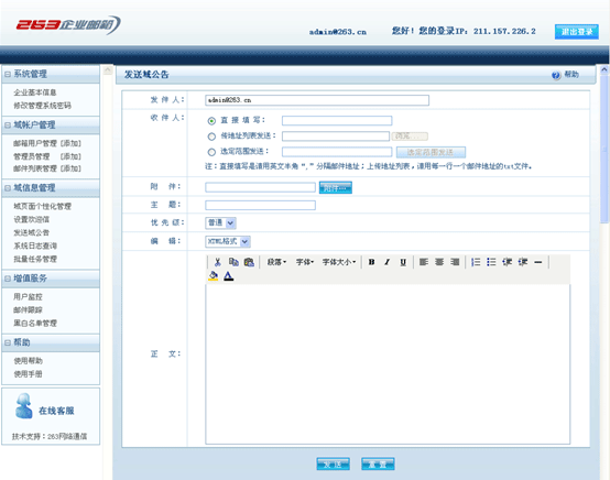 填写域公告的主题,选择发送的优先级别,填写域公告的内容,点击“发送”,公告将以邮件的方式发送给域内选定部门。