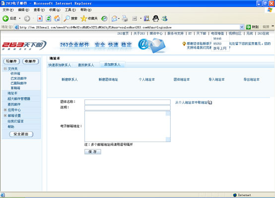 团体地址本的建立步骤与此类似,在地址本页面,点击右侧的"团体地址本",进入团体地址本编辑页面,点击页面左侧的"添加",进入下列界面: