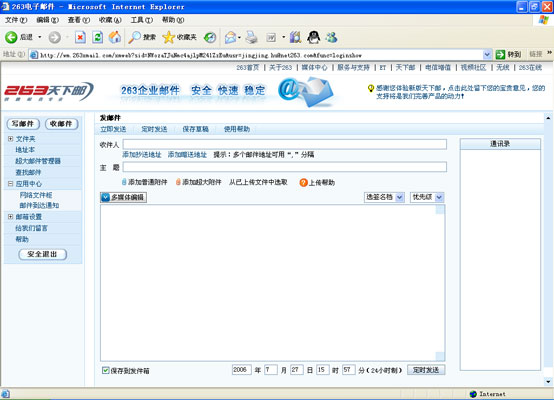 超大邮件功能有“发超大邮件”和“超大邮件管理器”两个部分。“发超大邮件”可以将存储在263邮件系统中的大文件以链接的形式发送给其他信箱账号,点击WEBMAIL左侧写邮件,可直接添加超大邮件。如下图: