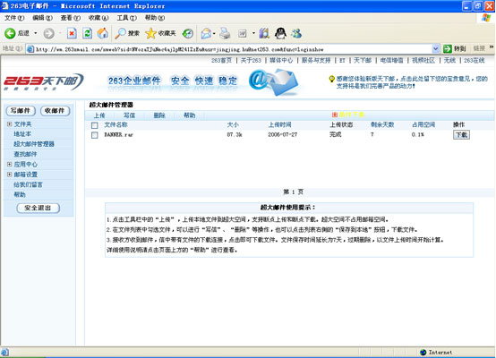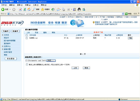 点击工具栏中的“上传”,页面下端出现文件上传输入/浏览框,可输入本地文件名或浏览本机上的文件,点击“上传”将文件上传到系统中本账号的超大空间,上传过程支持断点续传。超大空间不占用用户邮箱空间,最大为600M, 所上传的文件保存7天。